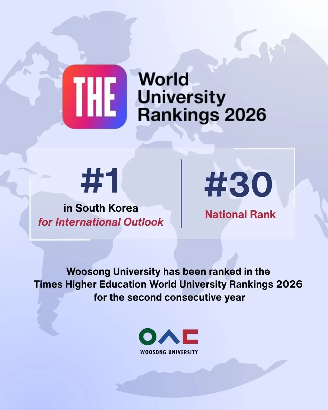 Woosong University is honored to be included in the Times Higher Education (THE) World University Rankings 2026. We are grateful to once again be recognized as #1 in South Korea for International Outlook for the second consecutive year, and ranked #30 nationally.